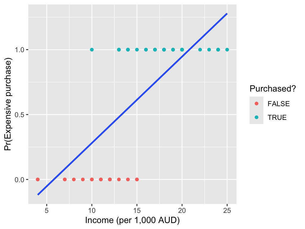 Fitting a linear model is often inappropriate for many types of response variables. For example, with binary data: